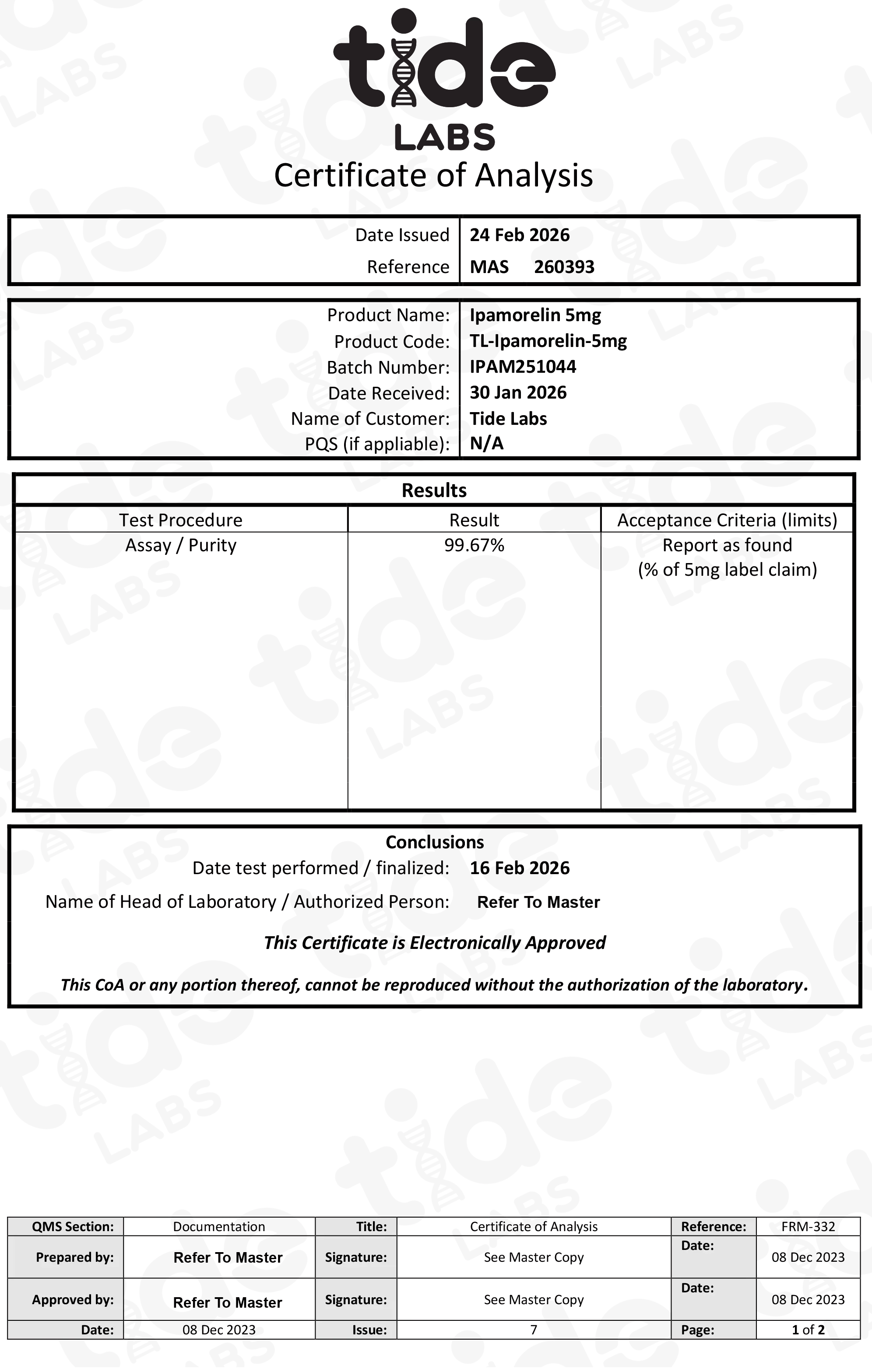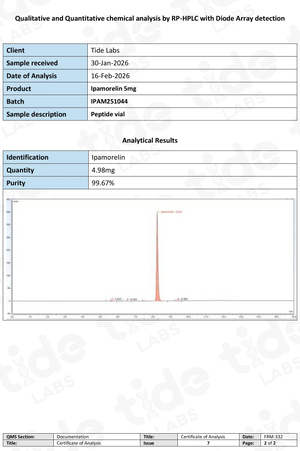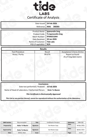 Ipamorelin is a synthetic pentapeptide classified as a selective growth hormone secretagogue (GHS). It belongs to the group of ghrelin mimetics, designed to stimulate the release of growth hormone (GH) without significantly affecting other hormones such as cortisol or prolactin. Because of this selective profile, Ipamorelin is a popular focus in preclinical research exploring growth hormone regulation, metabolism, and recovery pathways.